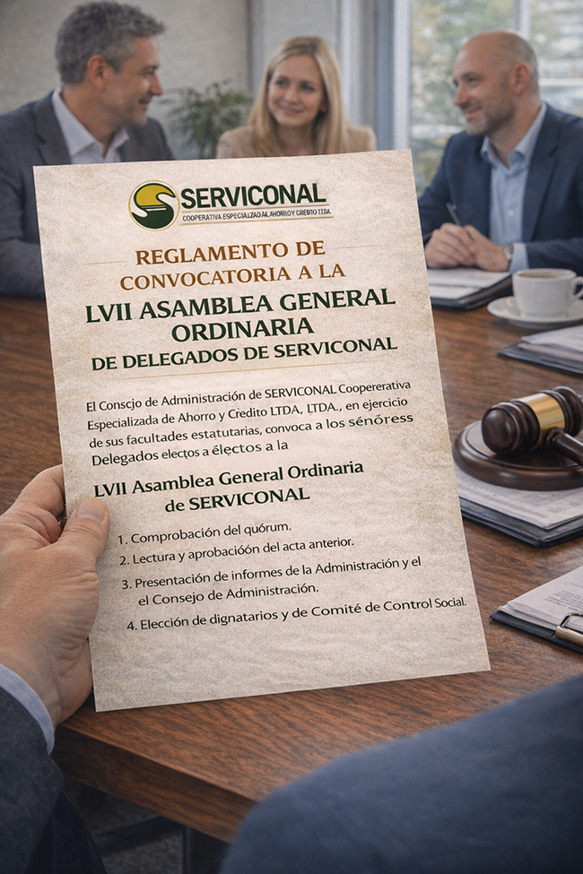 Se convoca a los asociados delegados principales y suplentes hábiles de la Cooperativa Especializada de Ahorro y Crédito Limitada SERVICONAL, elegidos para el período 2024–2027, conforme consta en el Acta del Consejo de Administración No. 0937-2024 del 1 de febrero de 2024, y verificados y autorizados por la Junta de Vigilancia según el Acta No. 0215-2024 de la misma fecha, a participar en la LVII Asamblea General Ordinaria de Delegados, la cual se realizará de manera presencial el domingo 15 de marzo de 2026, a las 8:00 a. m., en el Auditorio Mayor Lelio Olarte de Puente Nacional, Santander, ubicado en la Carrera 6 No. 6-98, sede principal de SERVICONAL.